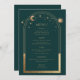 Mística Verde Dourada Sol Lua Estrelas Astronomia Galáxia Cósmica Celestial Cartões de Menu de Casamento Cósmico Apresenta um sol dourado, lua e estrelas sobre um fundo verde com seus detalhes cardápios no centro do moderno roteiro de caligrafia dourada. Personalize editando o texto nas caixas de texto fornecidas. Projetado por ©2022 Evco Studio em www.zazzle.com/store/evcostudio