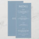 Modern and simple wedding menu in dusty blue. Clean and easy-to-read design that matches a minimalist modern wedding theme. Includes course description - starter, main course, desert and drinks information which is easy to edit and personalize.