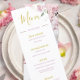 Design de Menu de Casamento Elegante Moderno, cor-de-rosa floral e ouro. Um design personalizado do Menu Casamento com suas informações facilmente alteradas para personalizar seu papel de carta de casamento. Papel de carta de casamento pessoal dos Designs Finos de Chessie.