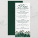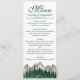 Este menu de casamento é simples, rústico e elegante. Ele apresenta um título de caligrafia de script de rico com montanhas de aquarela e pinheiros. A parte de trás é uma cor verde da floresta marmoreada. Perfeito para uma recepção ao ar livre.