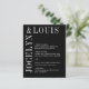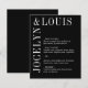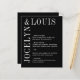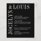 Menu de casamento moderno com um design preto minimalista com seus nomes em uma fonte grande ao lado esquerdo e superior. Esta design é simples o suficiente para um casamento formal, mas faz uma declaração ousada.
