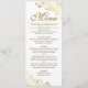 Este belo menu irá adicionar algum estilo à sua recepção de casamento. Ele apresenta um belo design com ornamentado de caramujos de folha de alumínio e espirais em um fundo branco clássico. Há espaço para os nomes do casal e da data do casamento, e o texto é totalmente personalizável.