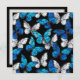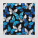 Borboletas realistas, azuis e brancas têm um padrão uniforme em fundo preto.