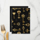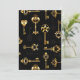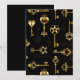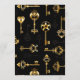 Padrão perfeito de chaves antigas, douradas e silhuetas em fundo preto.