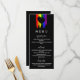 Carinhoso menu de casamento lgbt com a bandeira do orgulho arco-íris desenhada com traços bagunçados e adornada com um coração negro contra um fundo negro. Gay de cardápio de casamento em preto com batimentos cardíacos e arco-íris. Cardápio de casamento lésbico com coração em pincéis coloridos do arco-íris.