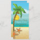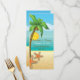 Palmeira e cardápio de destino de praia tropical, com um cenário tropical: palmeira com coco numa praia arenosa, mar azul/oceano e céu com sol e nuvens. Excelente para um casamento de praia, tropical. Azul, verde, amarelo, marrom.