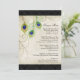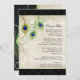 PALETA DE CORES: Preto, bege, creme, dourado, azul, verde e roxo. COLEÇÃO DE DESIGN: Cartão de menu de jantar de recepção ou evento formal correspondente. Esta é parte de Conjuntos de Convites de Casamento de produtos correspondentes completos. Estes Convites de Casamento de Penas de Pavão modernos e contemporâneos são modernos, elegantes e sofisticados. A arte é de arte original em aquarela pintada à mão por Audrey Jeanne Roberts. Há um fundo de renda texturizada, manchada de chá, envelhecida, estilizada, penas de pavão modernas e uma borda lateral de cor coordenada. No verso está o texto do convite de casamento personalizado, um conjunto de penas de pavão com floreios de espiral desenhados à mão em bege e um padrão damasco sutil de desenho de linha cal