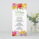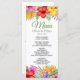 Este menu colorido mostra uma borda superior e inferior de flores tropicais suculentas em tons quentes vibrantes, tudo sobre um fundo branco nítido. Você pode clicar no link personalizar para adicionar seus próprios detalhes de menu. Você também pode alterar o estilo e a cor da fonte para seu gosto. Isso é parte de uma linda suite de casamento que pode ser totalmente personalizada.
