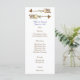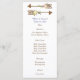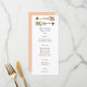 Aqui está um bonito cartão de cardápio de casamento que usa imagens brancas de setas decoradas florais e desenhadas à mão na borda superior. Seu texto personalizado está em marrom quente, com o nome da noiva, o nome do noivo e a data em azul. A imagem e o texto são colocados sobre um fundo branco elegante. A parte de trás do cartão é uma cor de pêssego clara. Certifique-se de ver os produtos de casamento correspondentes, incluindo convites e cartões RSVP, em nossa loja.