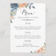 Pêssego impermeável de aquarela e flores botânicas azuis ardentes, cartão de cardápio de casamento. A placa apresenta um desenho desenhado à mão e acentos decorativos vintage. A parte traseira da placa apresenta cor azul empoeirada sólida.