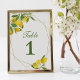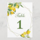 Esta placa de número de tabela de dois lados apresenta um modo limão de cor d'água acentuado por uma estrutura geométrica e uma letra verde vibrante. Um design maravilhoso para o seu evento temático de limão. Fabricado a partir de estoque de cartão resistente, para que possa ser utilizado num suporte ou numa armação.