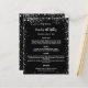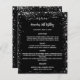 Um menu elegante e glamouroso. Um fundo preto, decorado com falso brilho prateado, faíscas. Texto branco. Personalize e adicione seu nome, datas e o menu. Você pode adicionar mais texto, fotos no verso. 1 folha = 1 menu impresso borda a borda.