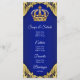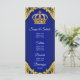 Cardápio Príncipe chá de fraldas com elegante coroa azul real e dourada sobre um elegante fundo azul real e espiral dourado. Esses menus reais de chá de fraldas azul e ouro são facilmente personalizados para seu evento simplesmente adicionando seus detalhes no estilo de fonte que você preferir.