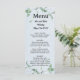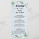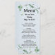 O cardápio do casamento, num fundo de precioso, apresenta um delicado ramo de folhas e uma bela caligrafia para os nomes do casal. Ambos os elementos acrescentam um pouco de elegância, contribuindo para o ambiente de licitação geral. Os itens de menu são apresentados com cuidado, refletindo a atenção do casal aos detalhes.