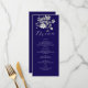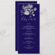 Coloque um tom sofisticado na sua recepção com este cardápio de casamento azul real com trabalho de arte floral prateado delicado e caligrafia elegante. Perfeito para casamentos no inverno formais, este design refinado destaca suas seleções de refeições personalizadas em um layout limpo e agradável.