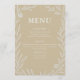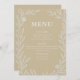 Adicione um toque de elegância do eterno à sua recepção de casamento com este cartão de cardápio botânico. Projetado para combinar com o conjunto de convites coordenador, este design apresenta um fundo bege quente enquadrado por delicada arte de linha floral branca e tipografia serif clássica. Totalmente personalizável em um bloco de texto de solteiro para facilitar o uso, ele é perfeito para listar iniciantes, redes, sobremesas e bebidas, ao mesmo tempo que mantém a decoração da mesa de recepção coesa. Ideal para casamentos rústicos, jardins ou minimalistas.