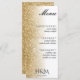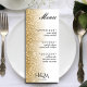 Placa de menu de recepção de casamento brilhante branca e dourada com texto preto. Tipografia elegante para um olhar caro sobre o preço do barato. Personalize a lista de refeições e os detalhes pessoais. Excelente para um tema de casamento feminino ou caprichoso/majestoso.