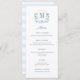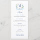 Este elegante design de menu azul e branco apresenta as minhas próprias ilustrações de aquarela (a crista e o banner de aquarela). Mostrada aqui para um Casamento, mas com algumas pequenas mudanças, esta design funcionaria lindamente para um batizado/batismo ou menu de festa de aniversário adulta.