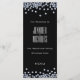 Um menu de recepção de casamento simples, mas bonito, preto e branco, com sotaques azuis. Nas bordas superior e inferior da placa estão faxes com efeito de diamante.