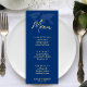 Menu de recepção de casamento do mapa do mundo azul e amarelo escuro com para um casamento de destino.