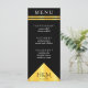 Placa de menu recepção de casamento preta com triângulo geométrico e faixas de bloco dourado. Tipografia elegante para um olhar caro sobre o preço do barato. Personalize a lista de refeições e os detalhes pessoais. Excelente para um moderno tema minimalista do casamento com um toque de estilo.