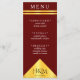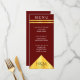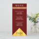 Cartão de recepção de casamento vermelho-escuro com triângulo geométrico de bloco dourado e faixas. Tipografia elegante para um olhar caro sobre o preço do barato. Personalize a lista de refeições e os detalhes pessoais. Excelente para um moderno tema minimalista do casamento com um toque de estilo.