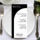 Placa de menu preta e branca com arco geométrico de blocos coloridos. Tipografia elegante para um olhar caro sobre o preço do barato. Personalize a lista de refeições e os detalhes pessoais. Excelente para um moderno tema minimalista do casamento com um toque de estilo.