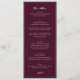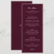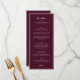 Um cartão de menu de casamento burgundy formal com um fundo rico em cores, título em letra cursiva elegante, tipografia serif clássica e uma borda refinada de linha dupla. Este menu de recepção alto de 10 cm x 23,5 cm é projetado para ambientes sofisticados e mesas de casamento coordenadas, com um layout polido que se adequa a celebrações tradicionais, românticas e de gala.