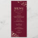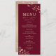 Crie uma atmosfera quente e romântica com este elegante cartão de cardápio de casamento, com um fundo burgundy rico, luzes brilhantes de cordas e delicados sotaques florais de ouro. Perfeito para casamentos rústicos, de outono ou noturnos, esta design traz charme eterno às suas mesas de recepção. Personalize com seus detalhes, nomes e data da refeição do casamento para adicionar um toque pessoal à sua celebração e impressionar seus convidados com estilo sofisticado.