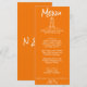 A colorful retro funky modern bright orange wedding dinner menu. Which features chic template design of boho vintage bright orange background and white typography and hand written menu in white. And hand drawn champagne glasses . With monogram in the back. Perfect and matching with the whole suite.
