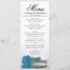 Este belo menu irá adicionar algum estilo à sua recepção de casamento. Apresenta um belo e romântico design com um céu solteiro azul, turquesa, ou rosa de cor azul, ao fundo do azure, refletindo numa piscina de água com ondas e ondulações. Há espaço para os nomes do casal e da data do casamento, e o texto é totalmente personalizável.