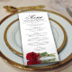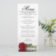 Este belo menu irá adicionar algum estilo à sua recepção de casamento. Apresenta uma design bela e romântica com uma rosa vermelha solteiro ao seu lado refletindo numa piscina de água com ondas e ondulações. Há espaço para os nomes do casal e da data do casamento, e o texto é totalmente personalizável.