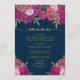 Jante no dia do seu casamento com este elegante menu azul floral com bonito tom rosa e púrpura buquê floral de rosas de aquarelas, folhas verdes e speck de ouro.