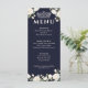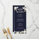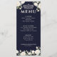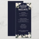 Menu elegante para quinceanera ou outra ocasião com princesa tiara e rosas brancas. O design tem uma paleta colorida de marinho escuro, azul-escuro, prata e branco cremoso. A coordenação de papelaria e decoração de festas está disponível na minha Coleção Princesa de Vestidos e Rosas Quinceanera, mas por favor, envie-me uma mensagem se precisar que eu acrescente outros itens.
