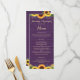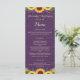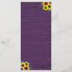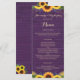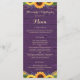 Este design rustico apresenta luzes de cordas de ouro e rendas junto com girassóis e lavandas contra um fundo de madeira roxo. O texto, com nomes personalizáveis de noiva e noivos e detalhes de eventos, aparece em ouro pálido na escrita popular e na tipografia serif. Você pode personalizar este menu para seu próprio casamento mudando o texto na modelo.