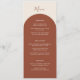 Introduce your reception dining with this elegant bohemian menu card, designed to coordinate with the terracotta arches collection while offering a fresh twist on the signature look. The front features a simple burnt orange arch curve that gracefully frames your meal details, including appetizers, main course selections, and desserts, all set against a light brown background. Retro design. This subtle variation creates a rich, natural copper backdrop that lets your menu information take center stage.