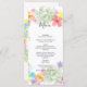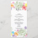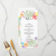 Este design apresenta uma coroa floral rústica de aquarelas. As belas flores verde e rosa, verde, púrpura, rosa, vermelha, laranja, azul e amarela combinam-se para criar uma coroa elegante rústica que rodeia alguns dos textos. As elegantes flores de aquarela são organizadas em torno dos nomes da noiva e do noivo. O uso da tipografia de classe para o texto do texto elogia a design. Esta design é ideal para qualquer tema de casamento. O design de cartão de menu perfeito para todas as estações. Os convites de casamento e outros artigos de papelaria também estão disponíveis.