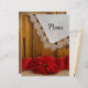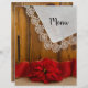 Personalize o encantador Menu de Casamento no inverno do País da Poinsettia Vermelha Russa com os nomes da noiva e do noivo, localização do local e detalhes da refeição que servirá no seu almoço de dezembro ou chá de panela de Natal sazonal, poste o brunch de casamento ou o janto de recepção de casamentos. Este menu casual, porém clássico, do tema rural rancho apresenta uma fotografia floral acinzentada de uma flor de poinsettia vermelha, uma fita vermelha de burlap e um lenço vintage aparado lenço de linhagem com um fundo de madeira marrom. Inspo perfeito para o seu evento informal de celebração de festa ao estilo do celeiro de fazendas.