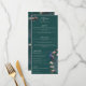 Este cardápio de casamento rústico e moderno apresenta ilustrações desenhadas à mão do estilo "Chinoiserie" de uma ave pavão azul e lacrimogênea cercada por Magnolia greenery, mostrando creme vibrante e flores cor-de-magnólia cor-de-rosa pinceladas, todas contra um elegante fundo verde-negro. O verso apresenta um elegante padrão floral e de pássaros com ilustrações coordenadas. Todo texto é editável. Personalize com seus detalhes de casamento, incluindo nomes de noiva e noivo, aperitivo, curso principal, mesa de sobremesa e bebidas.