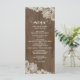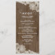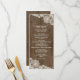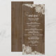 Design de cardápio moderno ao ar livre com elementos elegantes no topo e no fundo em um fundo impresso de textura falsa de madeira. Um design elegante e na moda, perfeito para casamentos temáticos ao ar livre ou vintage! Esta design faz parte de uma suíte de casamento "Rustic Wood and Lace". Itens correspondentes estão disponíveis. Clique no botão PERSONALIZAR TI para personalizar fontes, mover texto e criar seu próprio design de convite exclusivo.