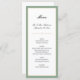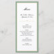 Este cartão de cardápio clássico oferece um fundo branco limpo, acentuado com uma faixa verde-sábio e borda dourada. A cor verde de sábio pode ser alterada escolhendo personalizar.