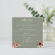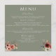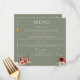 O Sage Green Elegant Floral Square Wedding Menu é uma obra-prima que combina perfeitamente a sofisticação com a beleza natural, fazer a escolha perfeita para noivas que buscam um toque de elegância eterno para seu casamento outono. O cardápio é feito com atenção minuciosa ao detalhe, garantindo que serve não só como um guia prático para os convidados, mas também como um banquete visual que complementa a estética geral do casamento. A cor predominante do cardápio é um verde-sábio rico e encantador, que lembra os tons de terra da folhagem de outono. Essa escolha não só traz um toque de calor, como também ressoa com a beleza orgânica da estação. O formato quadrado do próprio menu introduz uma reviravolta contemporânea, oferecendo uma canvas única e moderna para os belos elementos design. Adorando o menu está um conjunto de intrincados padrões florais que evocam a essência de um jardim florescente. Ilustrações deliciosas de aquarelas das flores, em variados tons de burgundy, blush e ouro, estão meticulosamente espalhadas pelo menu, criando uma interação harmoniosa de cores que espelha as mudanças de tons de outono. Os motivos florais estão elegantemente arranjados, contribuindo para um senso geral de graça e refinamento. A tipografia escolhida para o cardápio é igualmente saborosa, com uma mistura de roteiros e fontes serif que exaltam sofisticação. Os títulos e os itens de menu são apresentados numa burgundy rica, fornecendo um contraste impressionante com o pano de fundo verde sábio. Essa opção não só garante a legibilidade como também adiciona um toque de opulência ao design geral. Como um todo, o Menu de Casamento Floral Quadrado Verde de Sage é um deleite visual, capturando a essência de um casamento outono elegante com sua paleta de cores ricas, padrões florais complexos e elementos temáticos pensativos. Este cardápio não só serve o seu propósito prático, como também se torna um bem-estar apreciado que reflete o compromisso da noiva em criar um dia de casamento que seja simultaneamente eterno e encantador.