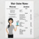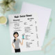 Modelo de lista de preços para salões de cabelo e cabeleireiros com ilustração fofa de Destei de uma mulher segurando uma bandeja que tem tesoura e pente em um vidro. A mulher tem cabelo preto longo que está em um rabo de cavalo. Ela está vestindo uma camisa colorida de cinza e calças pretas. Personalize os modelos de texto com os detalhes de sua empresa.