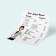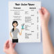 Modelo de lista de preços para salões de cabelo e cabeleireiros com ilustração fofa de Destei de uma mulher segurando uma bandeja que tem tesoura e pente em um vidro. A mulher tem cabelo preto longo que está em um rabo de cavalo. Ela está vestindo uma camisa colorida de cinza e calças pretas. Personalize os modelos de texto com os detalhes de sua empresa.