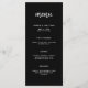 Este elegante e mínimo cartão de cardápio de casamento apresenta uma tipografia moderna de escrita e texto limpo, branco, sans serif em um fundo preto escuro para um simples e na moda design que você vai adorar.