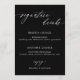 Menu de bebidas com assinatura de caligrafia elegante em preto e branco.