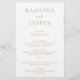 Folheto do menu de casamento do orçamento falso elegante (impresso neste papel de impressora) com um design simples e mínimo. Um layout clássico com seus nomes em letras grandes para uma reviravolta moderna para este estilo tradicional. Um cardápio de casamento perfeito para um casamento formal.