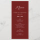 Este cartão moderno e minimalista de recepção de casamentos outono oferece um esquema simples e limpo num fundo burgundy. O design oferece espaço para você adicionar seus itens de menu de recepção de casamento junto com os nomes da noiva e do noivo e a data do casamento.