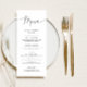 Cartão de menu de janto de casamento elegante e mínimo com texto de script moderno.