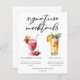 Esta folha de menus de assinatura de praia apresenta uma típica tipografia preta acima de 2 bebidas bonitinhas e seus ingredientes para o seu bar de casamento de verão. Uma bebida virgem de morango Daiquiri e Piña Colada não alcoólica adicionam um talento legal ao seu cardápio de bar. Preencha com os nomes dos casais e a data para sua recepção.